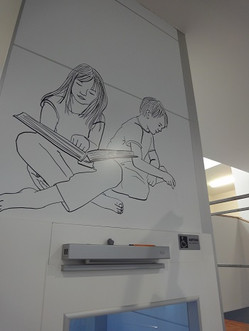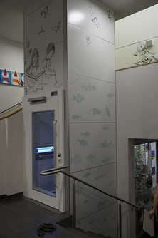 Aus dem Buch des Mädchens steigen Buchstabenwesen auf. Sie tragen den jeweiligen Buchstaben am Anfang ihres Namens (z.B. I- Igel, B- Biene, R- Ritter,…), wobei der Buchstabe aus gestalterischen Gründen manchmal groß und manchmal klein gezeichnet wurde. Wie in einem Wimmelbuch versuchen die Betrachter, die Lebewesen zu entdecken und den entsprechenden deutschen oder slowenischen Begriffen zuzuordnen. Diese kleinen und großen Buchstabenwesen winden sich in einer dynamischen Drehbewegung über die linke Seite des Liftes bis in den ersten Stock und laden zum Herumgehen und Erkunden ein.